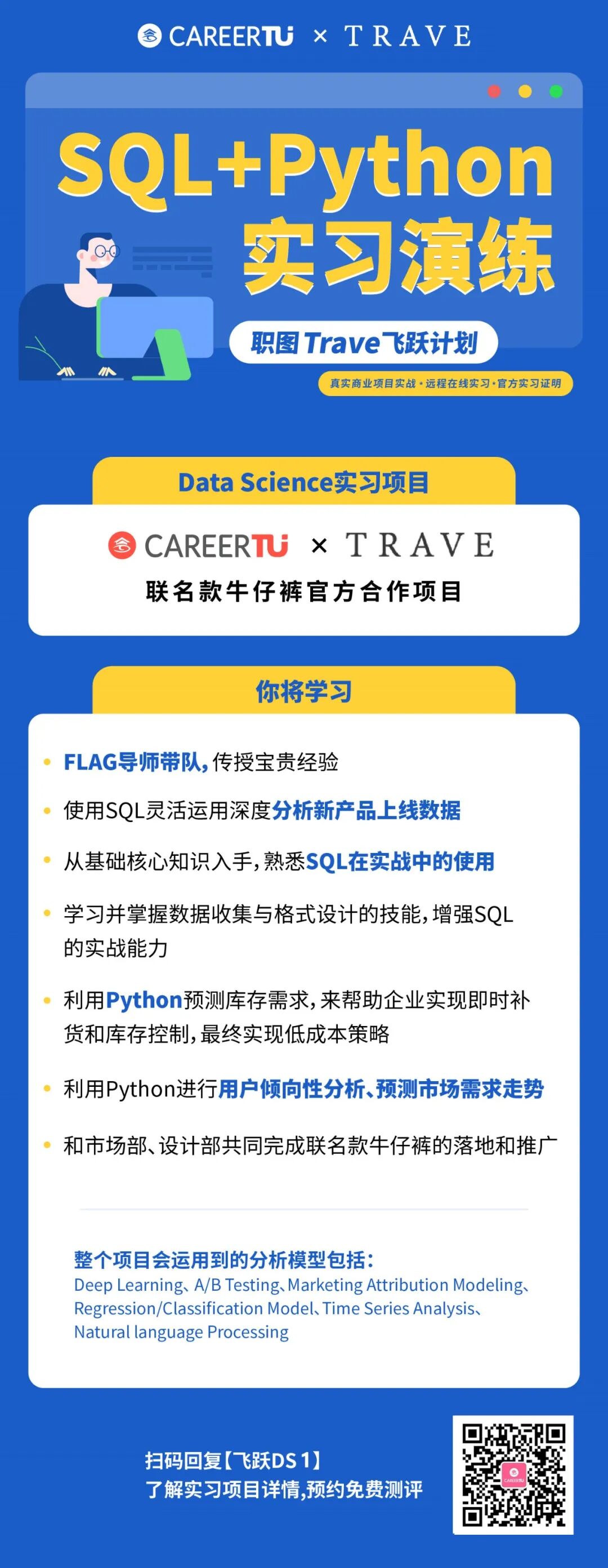 另一大求职数据科学的关键点在于是否有丰富的项目经验。数据科学区别于传统的程序员职位,不仅要求你有扎实的数理和编程能力,更需要你亲自动手完成项目的实战经历。在校同学课堂上学了不少理论知识,但却往往缺少实际案例的支撑,容易“学而无用”。职图的Trave飞跃计划,则为同学们提供了难得的项目实战机会。给你一段高含金量远程实习,足不出户跟随一线名企导师巩固数据分析相关技能!