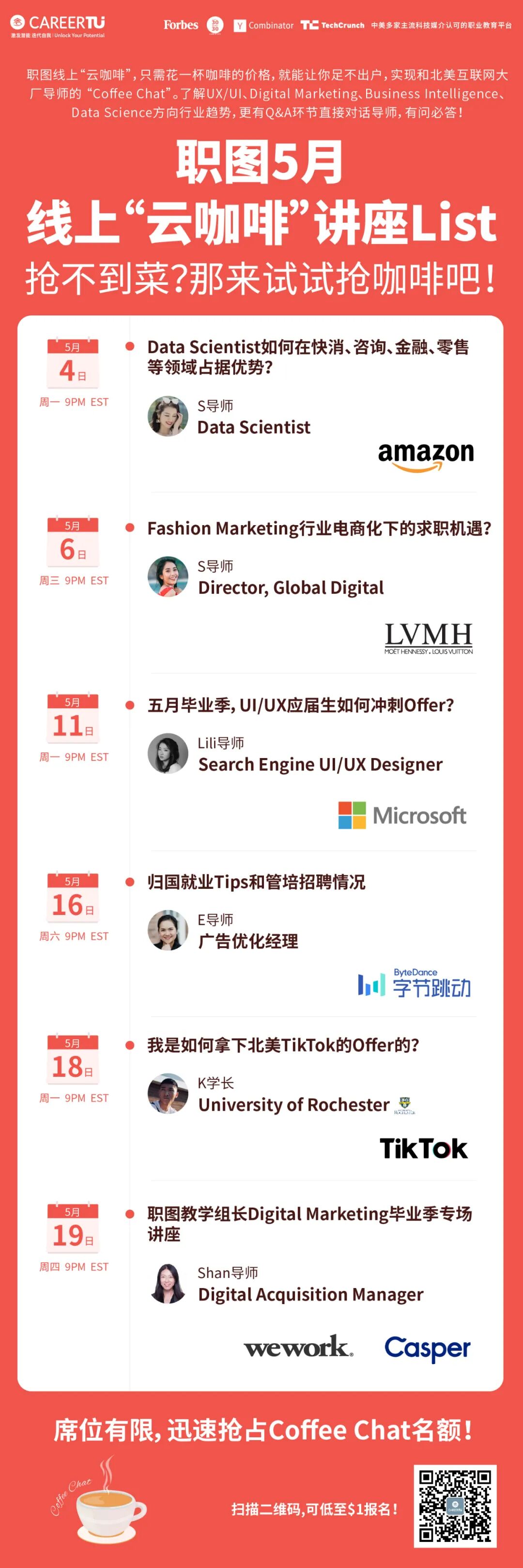 不管你是在找全职还是实习,留在美国还是回国五月都是重要的时间,务必要充分利用好五月求职季,做好规划,拿下自己心仪的Offer!在这个冲刺的时间里,学姐准备了3个助力包,助力同学们全力冲刺5月求职季!