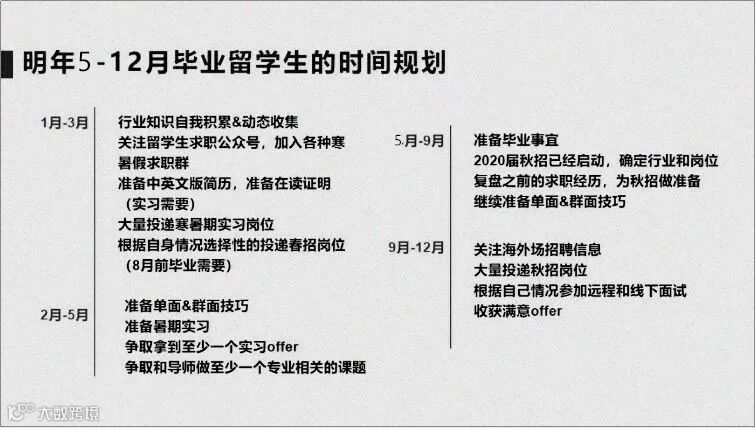 国内面向应届生的校招多在7月到12月之间,而近年互联网大厂抢人时间更加提前,去年京东在5月底就打响了2019年秋招的第一枪,而海归毕业时间一般为5月或12月,容易错过校招时间,加上长期身在国外,对国内招聘信息接收不及时,往往错过很多国内名企的招聘机会...