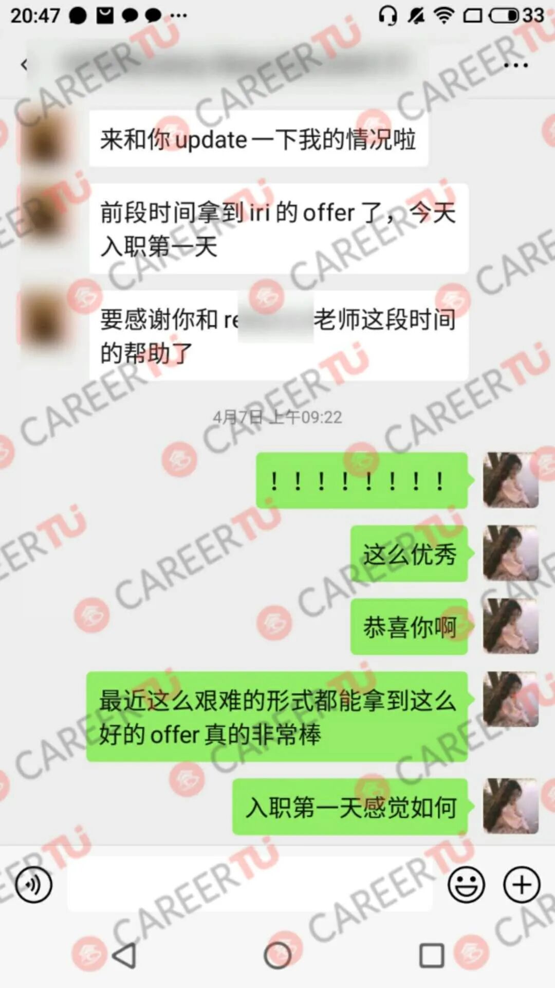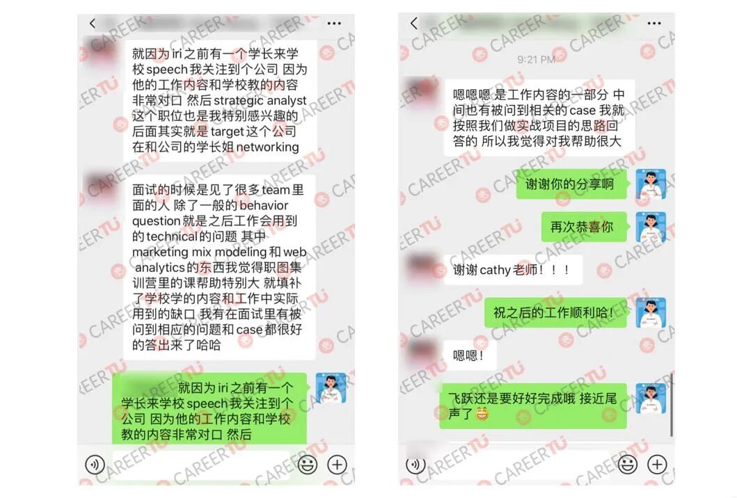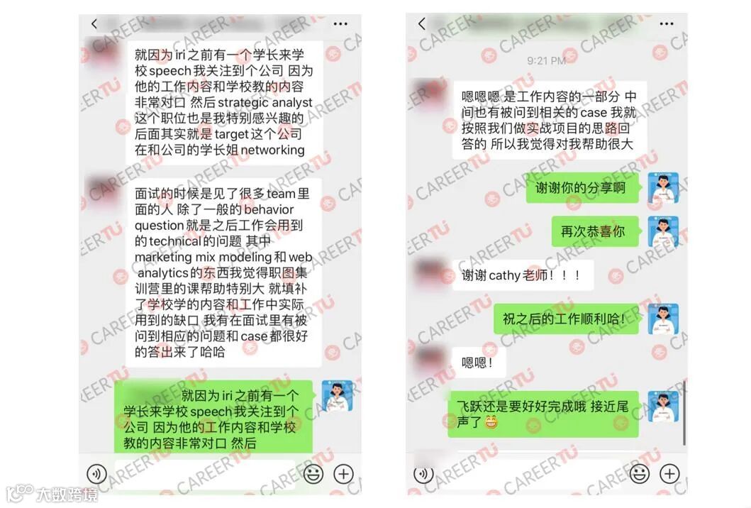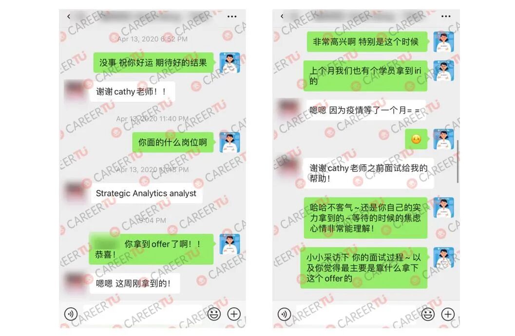 V学员也分享了她这份工作的求职经历。之前IRI有学长去他们学校做讲座,然后同学就开始关注到了这个公司。因为这个公司的主要业务和V学员在学校里学的知识非常对口,然后V学员本身也对Strategic Analyst这个职位特别感兴趣,之后V学员就开始有针对性地与在这个公司工作的学长学姐进行Networking。然后面试内容除了一般的Behavioral Questions,就是之后工作中会用到的Technique Questions,包括Marketing Mix Modeling和Web Analytics。因为同学本身的专业背景是Business Analytics,再加上在职图的数据分析强化学习,V学员最后成功通过了技术面试。祝愿V学员在接下来的工作中能获得更好的职业发展!