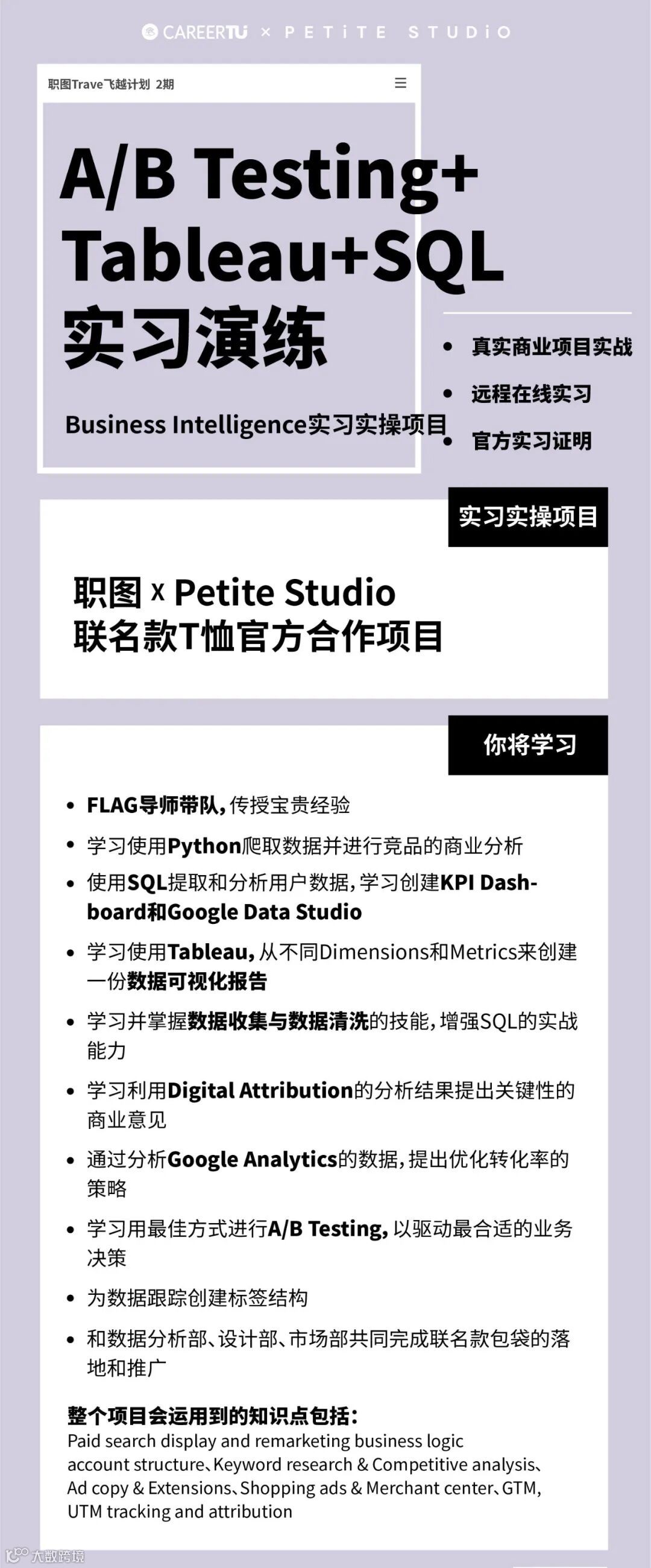在加入职图项目后,职图教学组为其匹配了在Microsoft做Business Analytics的行业资深导师进行一对一辅导。通过职图的金牌集训营课程, V学员学习了Marketing Analytics领域的Marketing Attribution的基础知识和Marketing Mix Modeling的建模方法和运用,同时掌握了Web Analytics的流程和Data Preparation, Data Analysis和Data Visualization的方法。填补了学校学的内容和工作中实际运用的技能的缺口。然后在职图与Parisa Wang合作的实战项目中,V学员收获了实操使用Python、SQL提取与分析数据的经验,并使用了Tableau来创建KPI Dashboard。在面试中,V学员将在集训营和飞跃计划Parisa Wang实战项目里学到的知识和商业案例解决思路灵活运用到Case Study中,成功地答出了面试中的关键问题。在准备面试的过程中,职图教学组的老师也给予了同学帮助和鼓励。最终在她的努力下,和与职图的积极配合,V学员成功地拿下这份全职Offer!
