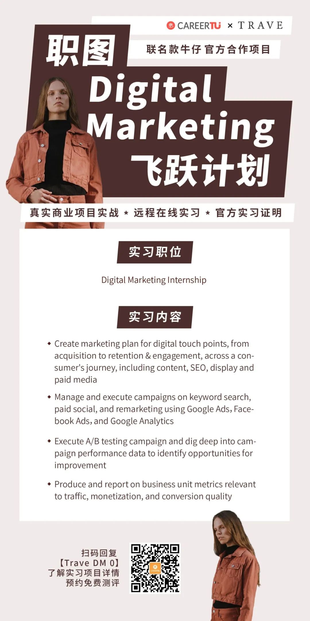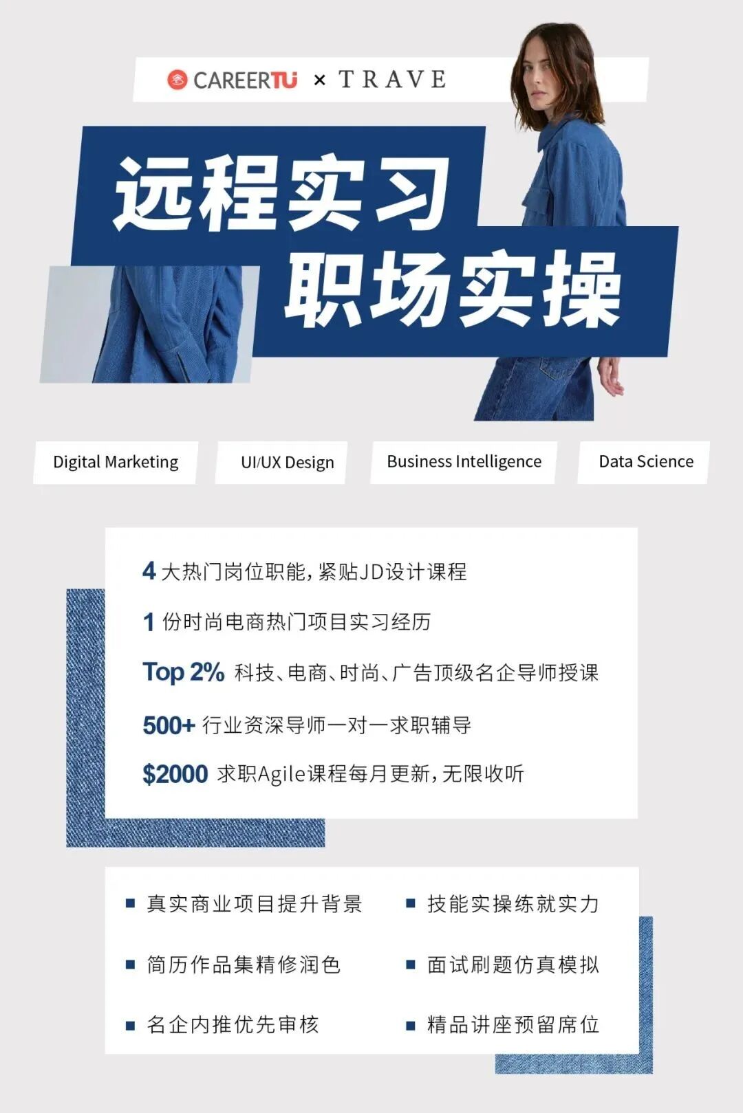 职图将与加州设计师品牌Trave合作推出飞跃计划专项,在全球范围内招收Digital Marketing, Business Intelligence, Data Science以及UI/UX Design四大方向的同学共同参与到联名款牛仔裤项目中,帮助同学们获得实际项目推广、落地、优化的全过程实操经验。