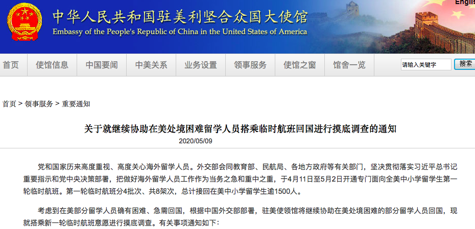 而最近!中华人民共和国驻美国大使馆发布了重要通知:祖国将继续派包机接滞留国外的留学生回国,包括成年留学生!