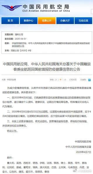 4月7日,中国民用航空局、中华人民共和国海关总署联合发布《关于中国籍旅客乘坐航班回国前填报防疫健康信息的公告》。根据《公告》,自4月8日起,从意大利、美国、西班牙等26个国家已购买回国机票的中国籍旅客需要提前填报防疫健康信息。