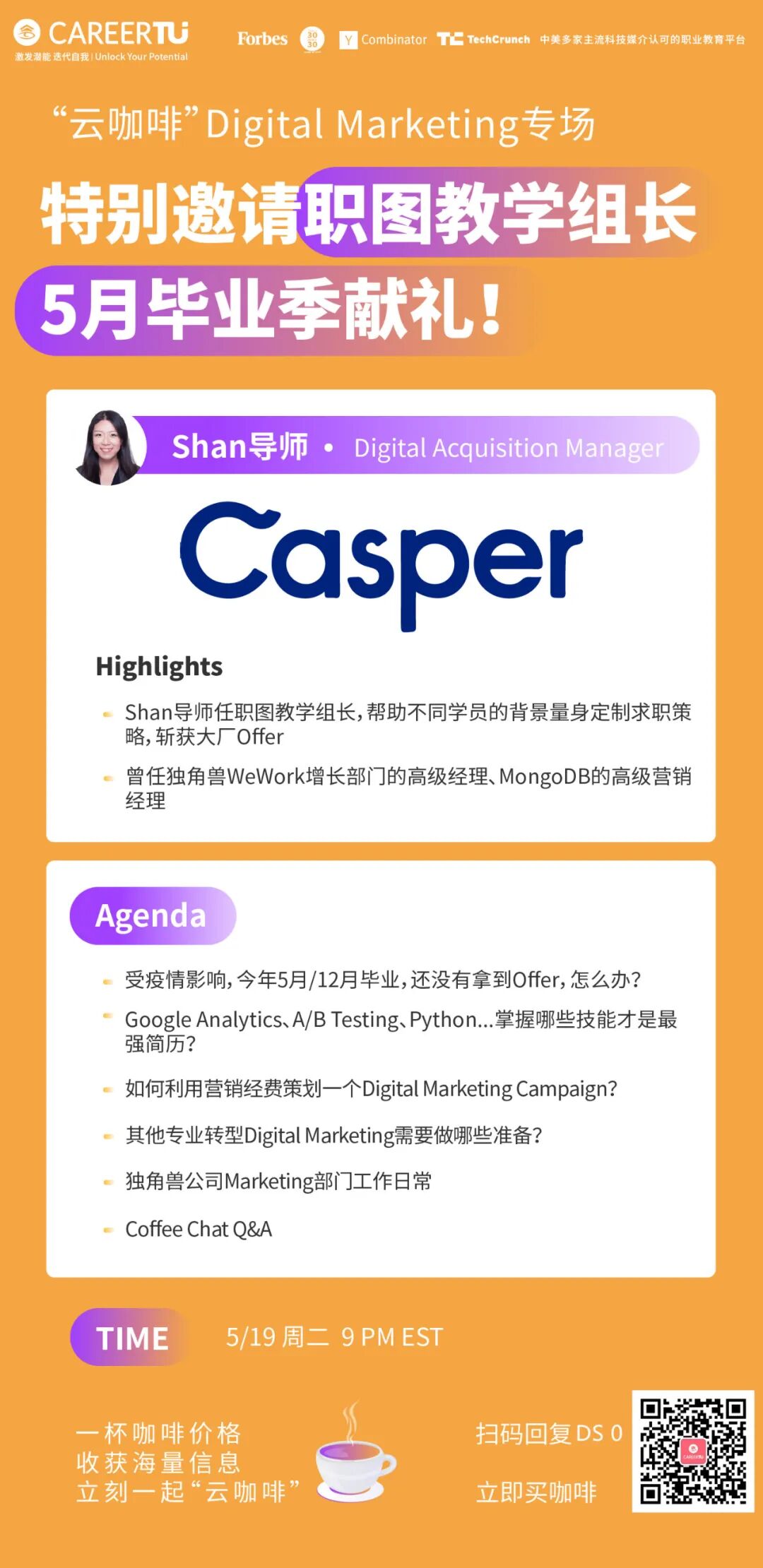 在本次云咖啡讲座中,曾任独角兽WeWork增长部门的高级经理、MongoDB的高级营销经理,现任Casper Digital Acquisition Manager的教学组长Shan导师,将从不同角度来解答大家关于今年毕业求职的问题!