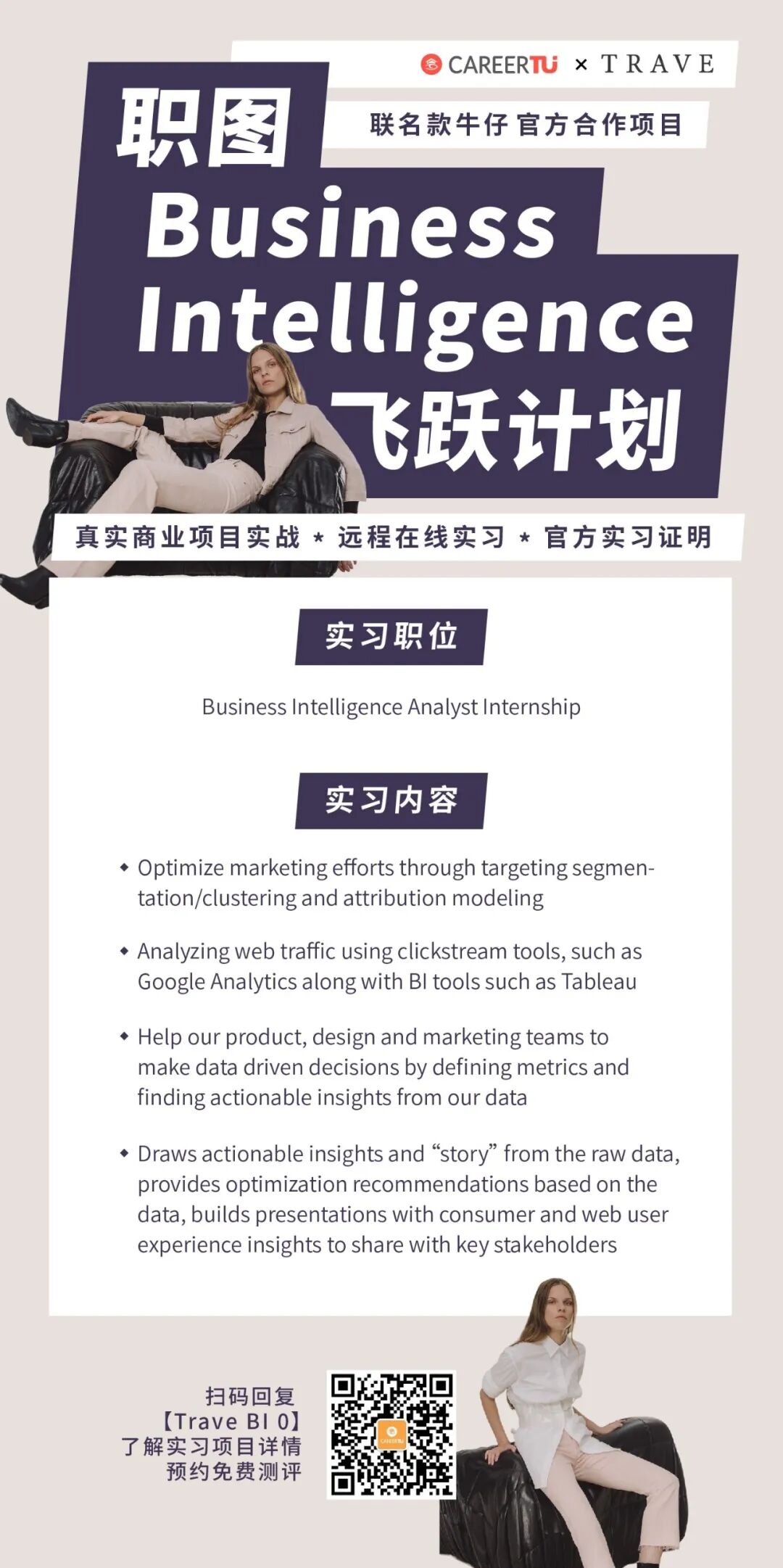职图将与加州设计师品牌Trave合作推出飞跃计划专项,在全球范围内招收Digital Marketing, Business Intelligence, Data Science以及UI/UX Design四大方向的同学共同参与到联名款牛仔裤项目中,帮助同学们获得实际项目推广、落地、优化的全过程实操经验。