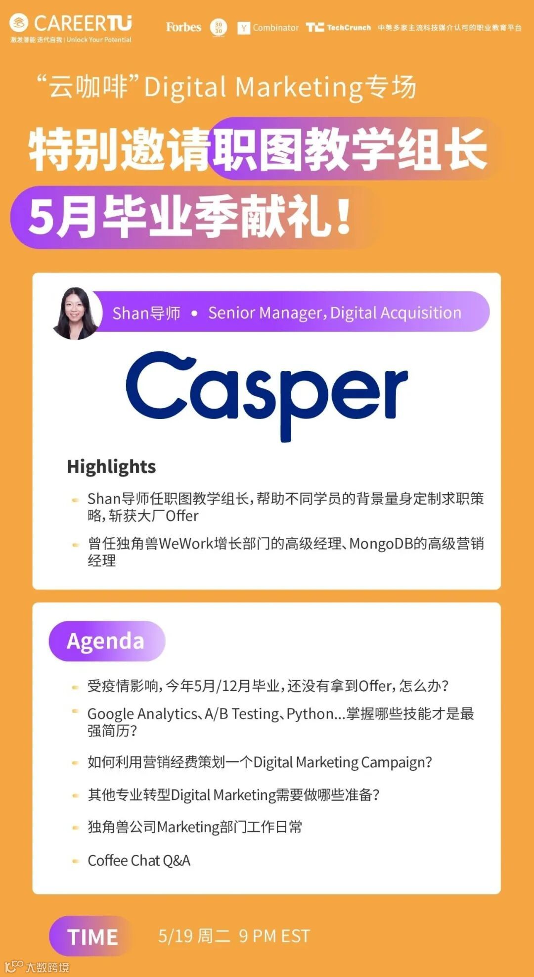 在本次云咖啡讲座中,曾任独角兽WeWork增长部门的高级经理、MongoDB的高级营销经理,现任Casper Digital Acquisition Manager的教学组长Shan导师,将从不同角度来解答大家关于今年毕业求职的问题!