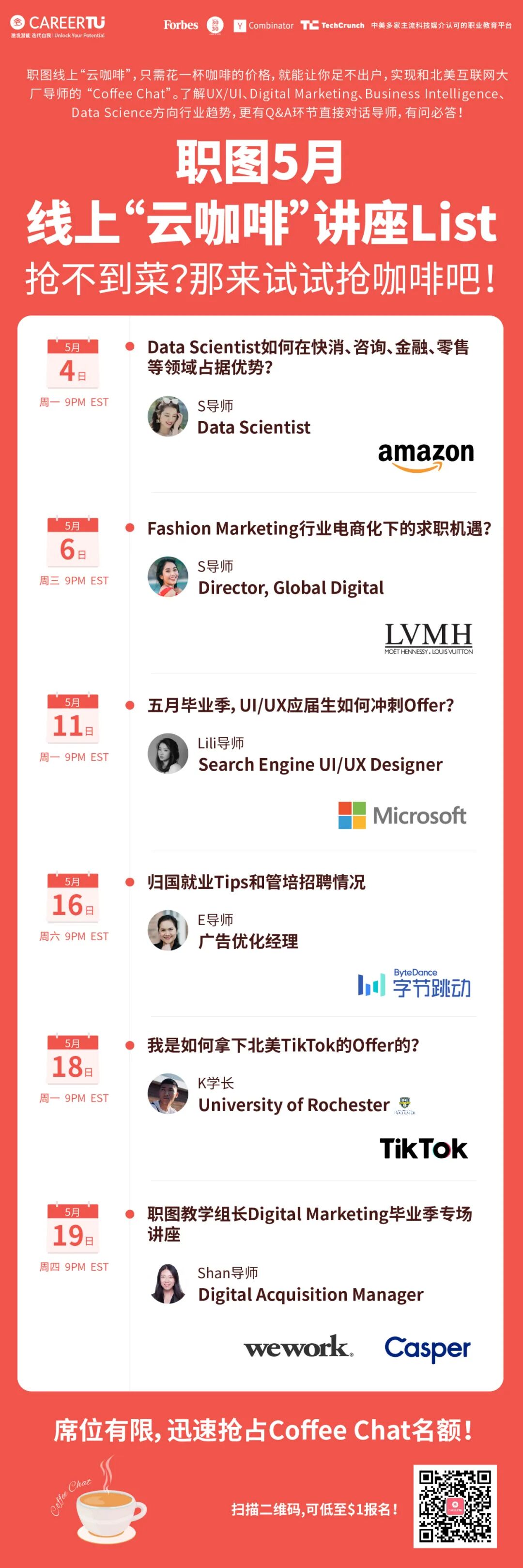 不管你是在找全职还是实习,留在美国还是回国五月都是重要的时间,务必要充分利用好五月求职季,做好规划,拿下自己心仪的Offer!