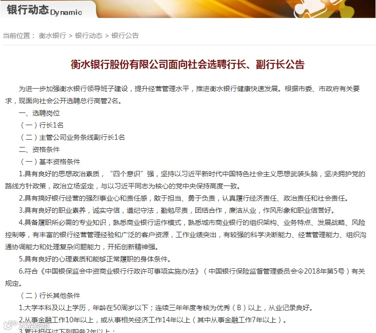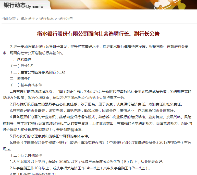 近日,河北省地方银行衡水银行发布选聘公告,面向社会选聘总行高管2名,包括行长1名、主管公司业务条线副行长1名。