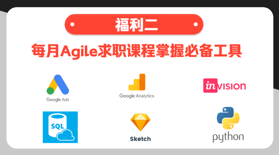 求职Agile课程,以工作中的实用工具和协作能力为出发点,涵盖SQL、Python、Google Analytics、Google Ads、Tableau、Mailchimp 、Sketch等,每月更新,帮助同学们快速与业界接轨。