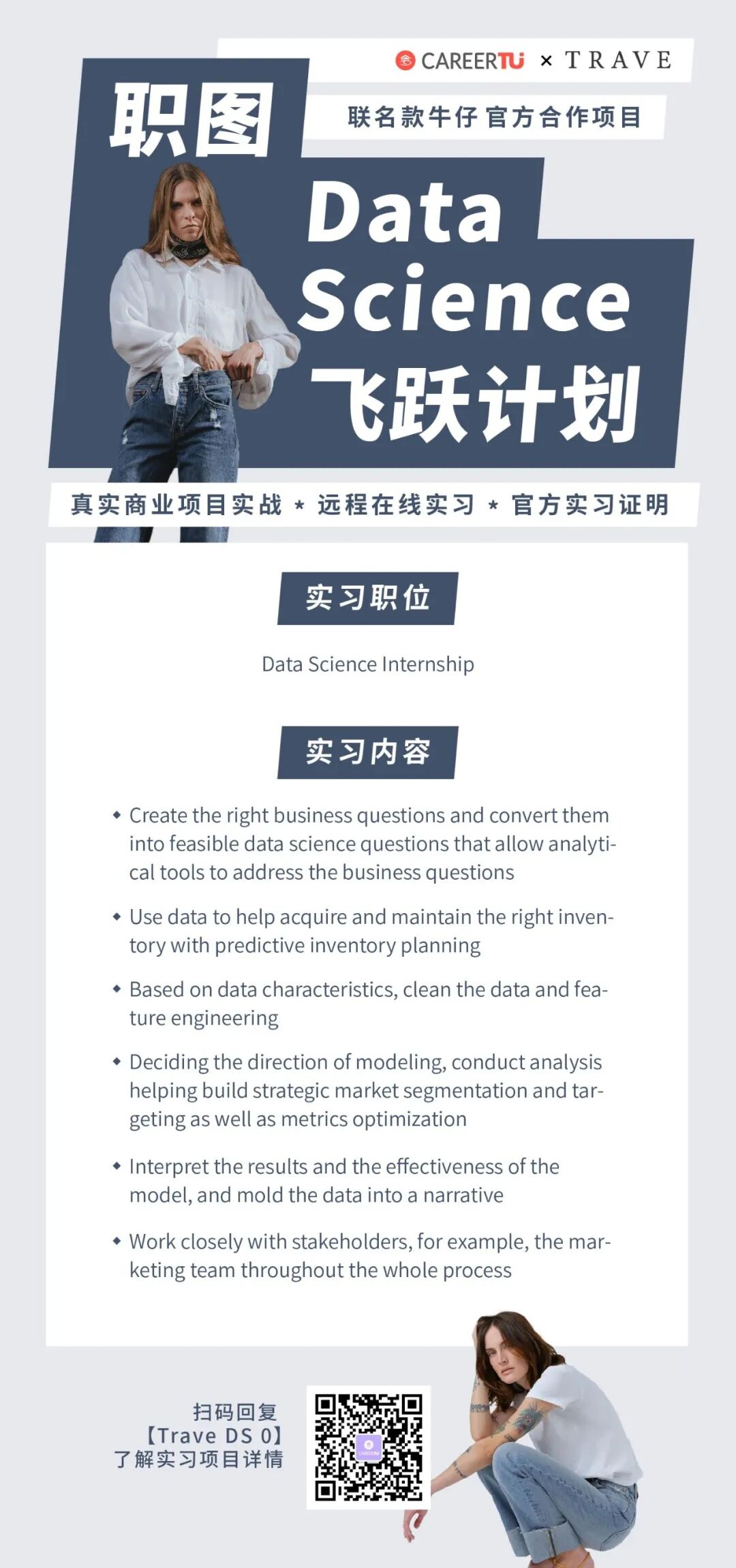 牛仔裤可以说是搭配小能手,不论是科技界、教育界还是时尚界人士都爱穿。而职图与Trave牛仔品牌推出的实战项目,将为你带来一份高含金量时尚行业的实习经历,给你的简历增添光彩。