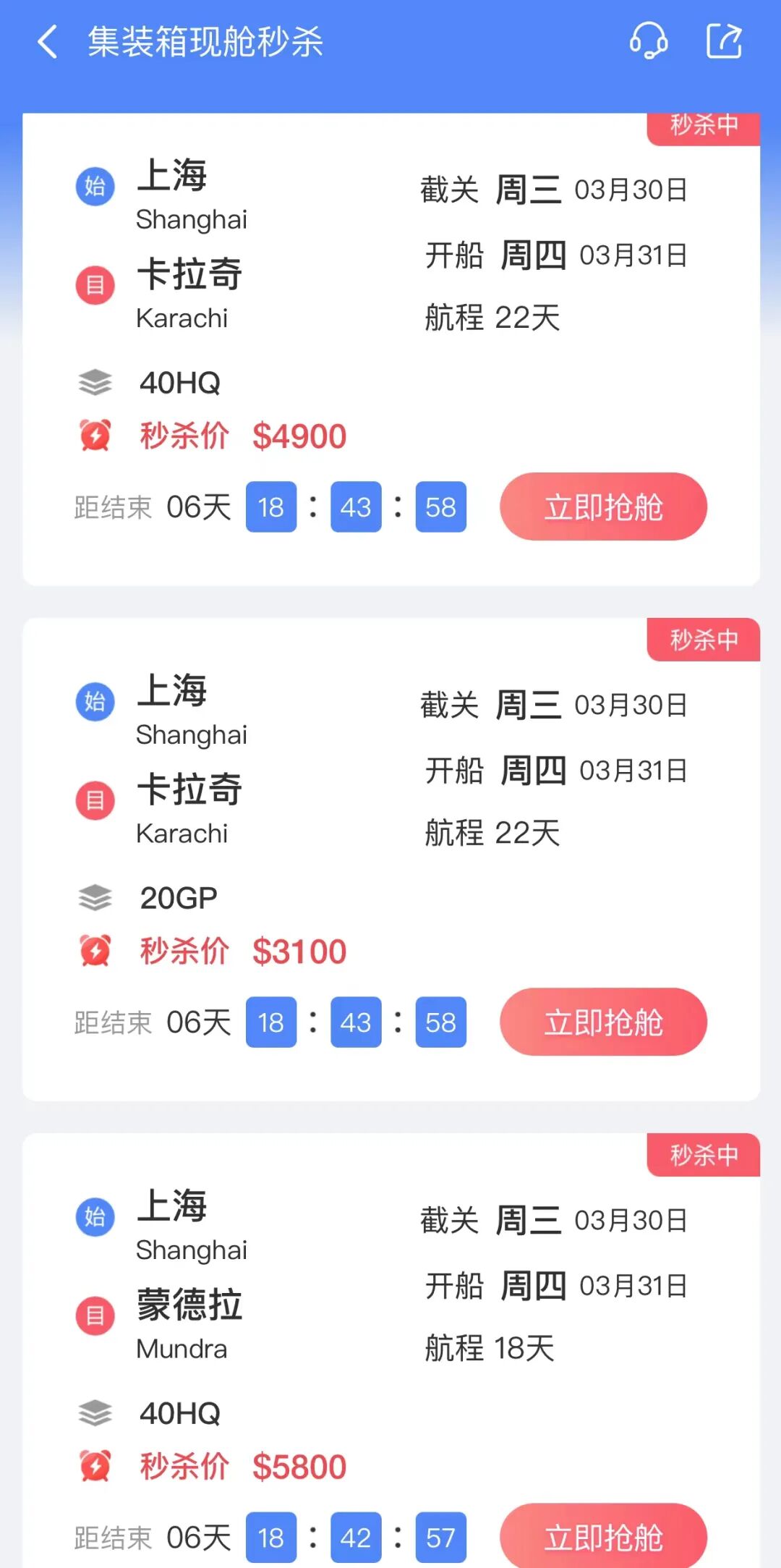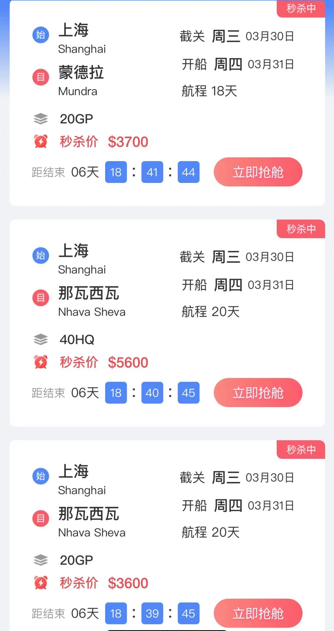 3/23集装箱舱位秒杀一览