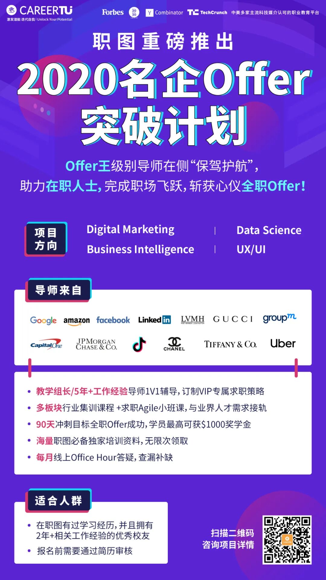 职图邀请了Data Science、Digital Marketing、UIUX、Business Intelligence四大方向的热门领域的教学合伙人/教学组长/Offer王级别/工作经验5年以上的导师带队,一对一辅导,保驾护航