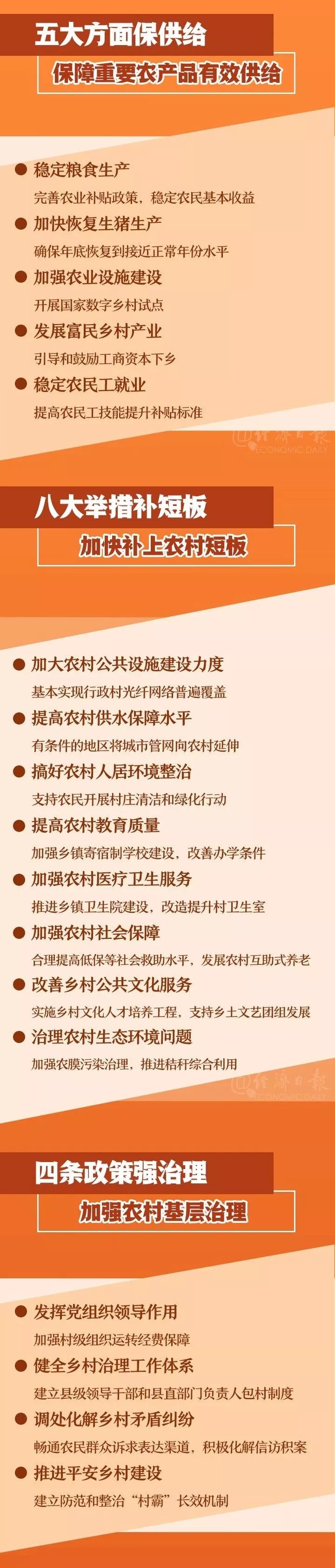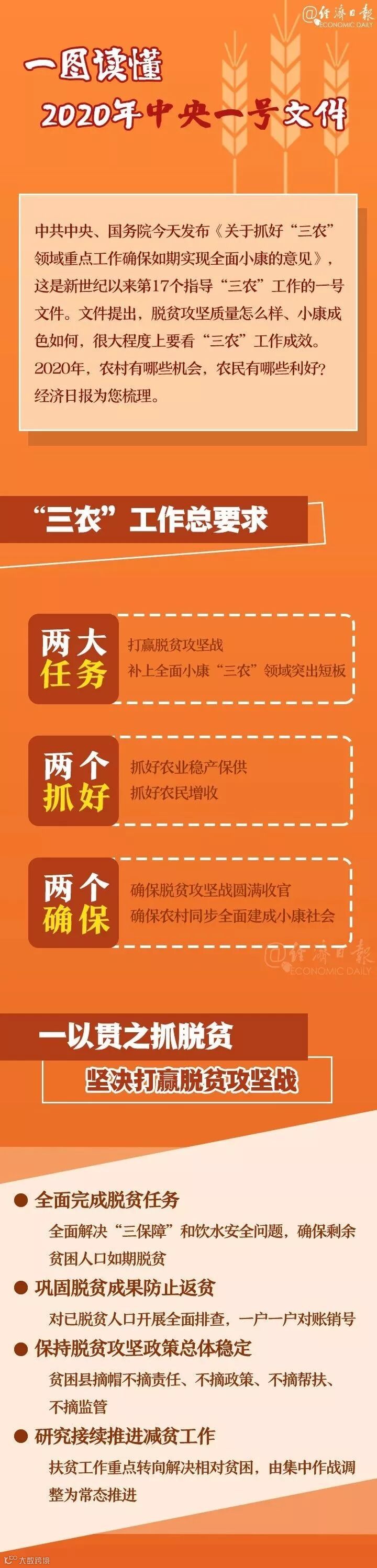 《中共中央 国务院关于抓好“三农”领域重点工作确保如期实现全面小康的意见》5日发布。文件明确2020年两大重点任务是集中力量完成打赢脱贫攻坚战和补上全面小康“三农”领域突出短板,并提出一系列含金量高、操作性强的政策举措。一图带你了解↓↓↓