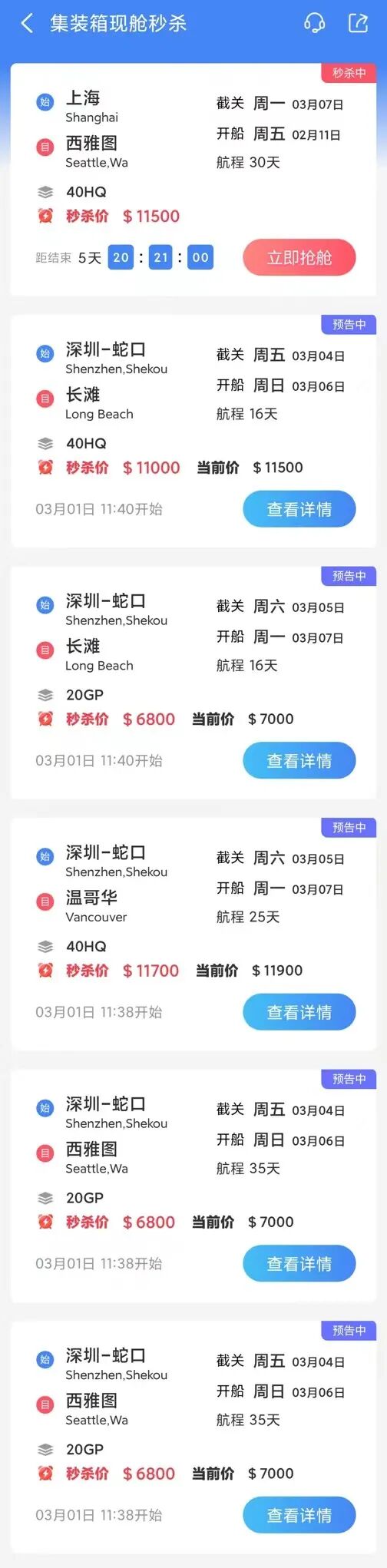 最新舱位秒杀一览