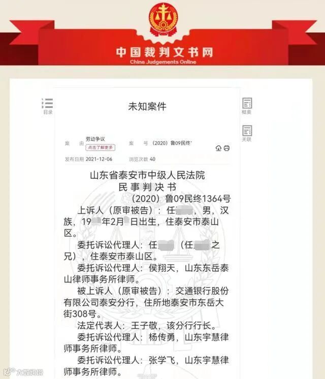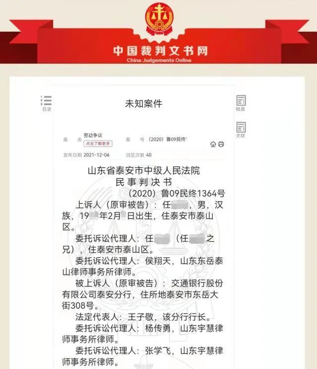 2017年5月,泰安市劳动人事争议仲裁委员会裁决撤销交通银行泰安分行作出的开除处分,继续履行劳动合同;交通银行泰安分行支付任某工资损失9030元。