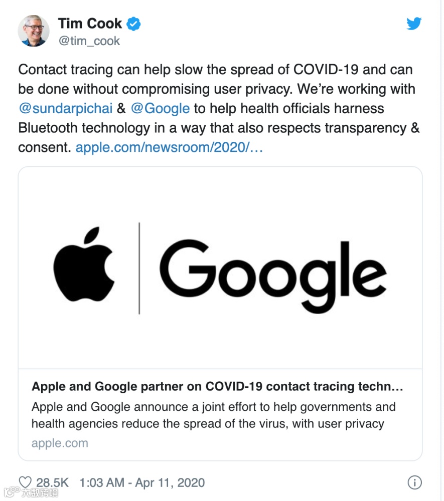 4月10日,两大科技巨头苹果和Google宣布将联手开发App新功能,用于追踪新冠病毒患者的密集接触者及传播路径。