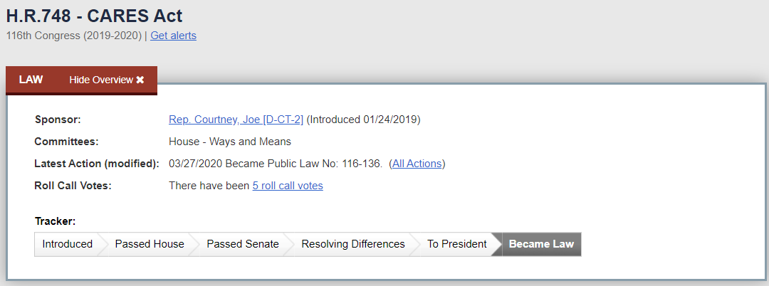 2020年3月27日下午,特朗普正式签署了H.R.748《新冠病毒援助、救济和经济安全法》。该法涵盖面广,包括对民生、企业、商业等各方面的援助,其中与民众生活有关的是给年收入在99,000美元以下者发放现金,其中收入75,000美元以下者每人可得1200美元、17岁以下儿童每人500美元;国税局4月9日开始将钱存入民众账户。