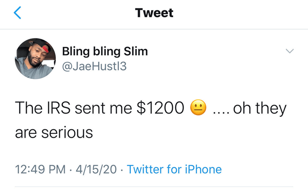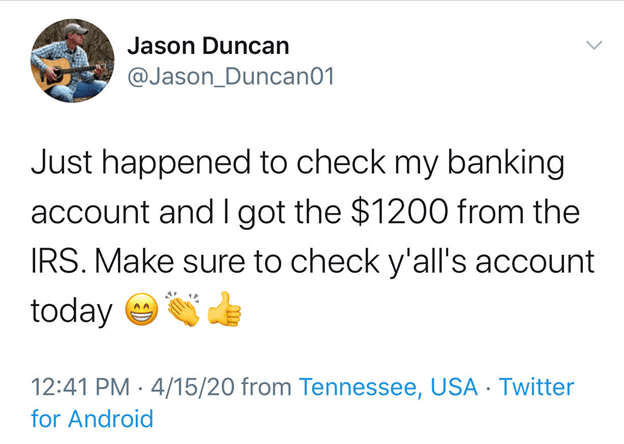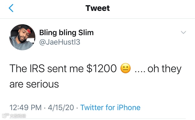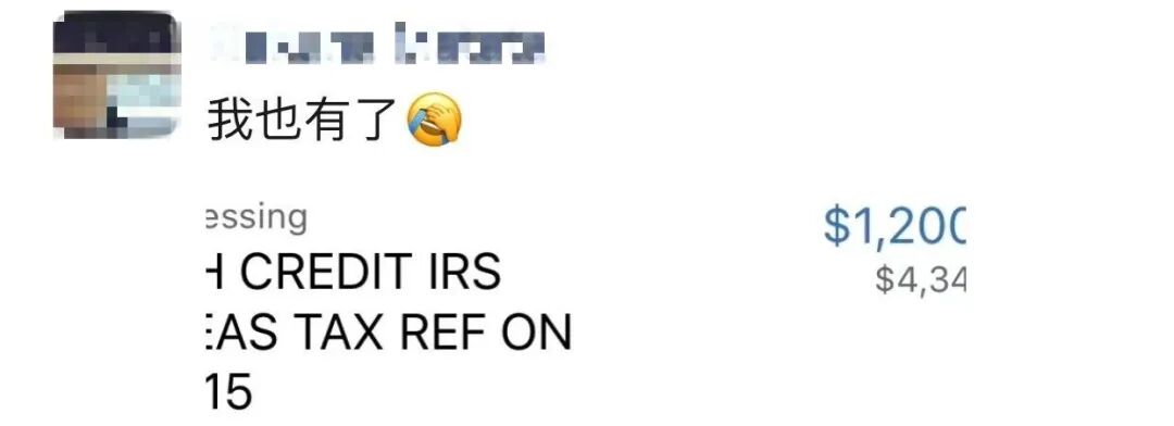 美国的社交帐号上也有很多朋友都反馈他们的银行账户里收到了美国国税局派发的1200美元: