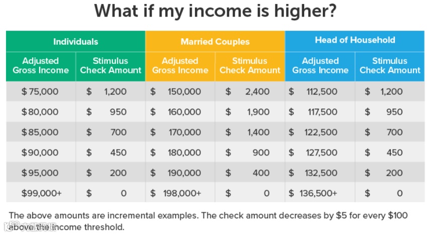 对于调整后总收入超过7.5万元的个人,获得的款项将开始逐步减少,而收入超过9.9万美元的个人则完全没有资格。无子女的夫妇总收入门槛是19.8万美元。此外,一家之主的年收入超过11.25万美元,或者夫妻共同报税超过15万美元,援助的金额也减少。