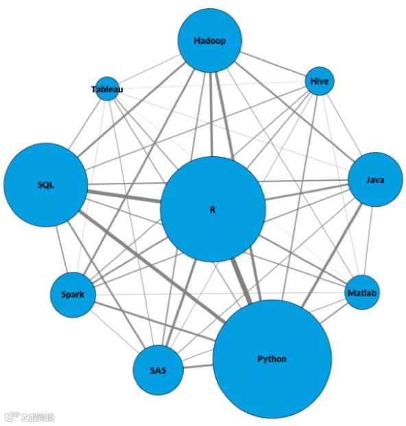 这是一张数据科学的共现网络可视化技能图,上图中最值得注意的是三个最大节点的大小,它们主宰了整个景观,这些技能是Python、R和SQL。