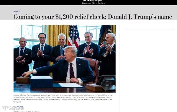 不过这笔“巨款”的发放过程还有一点值得吐槽:美国《华盛顿邮报》15日报道称,美国财政部已下令,将总统特朗普的名字印在国税局(IRS)将发放给数千万美国人的支票上。