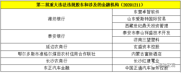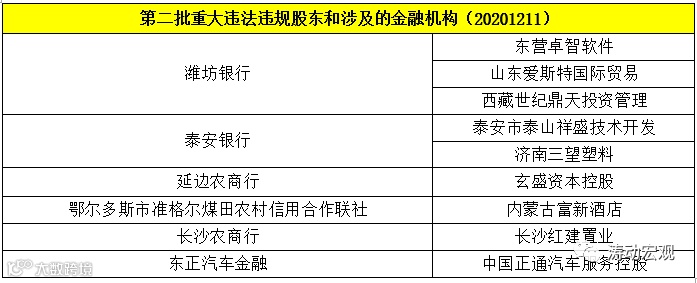 1、第二批公布的9家重大违法违规股东共涉及6家金融机构。其中,3家涉及潍坊银行、2家涉及泰安银行,另有4家股东分别涉及延边农商行、长沙农商行、东正汽车金融以及鄂尔多斯市准格尔煤田农村信用合作联社。