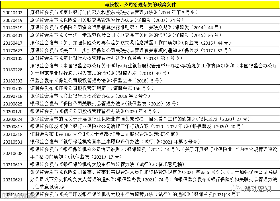(二)公司治理不完善、股权不规范很容易导致金融体系乱象丛生、干扰金融机构正常运行,为此近年来监管部门在金融机构公司治理与股权行为整顿方面持续加大力度,并发布了一系列政策文件进行规范。例如,2020年8月,银保监会印发《健全银行业保险业公司治理三年行动方案(2020-2022年)》,系统提出了三年内公司治理监管和改革的蓝图。