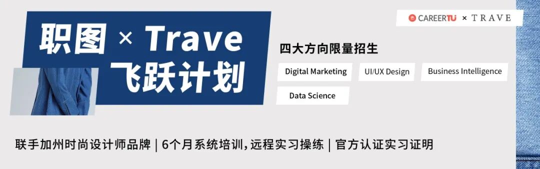 职图将与加州设计师品牌Trave合作推出飞跃计划专项,在全球范围内招收Digital Marketing, Business Intelligence, Data Science以及UI/UX Design四大方向的同学共同参与到联名款牛仔裤项目中,帮助同学们获得实际项目推广、落地、优化的全过程实操经验。
