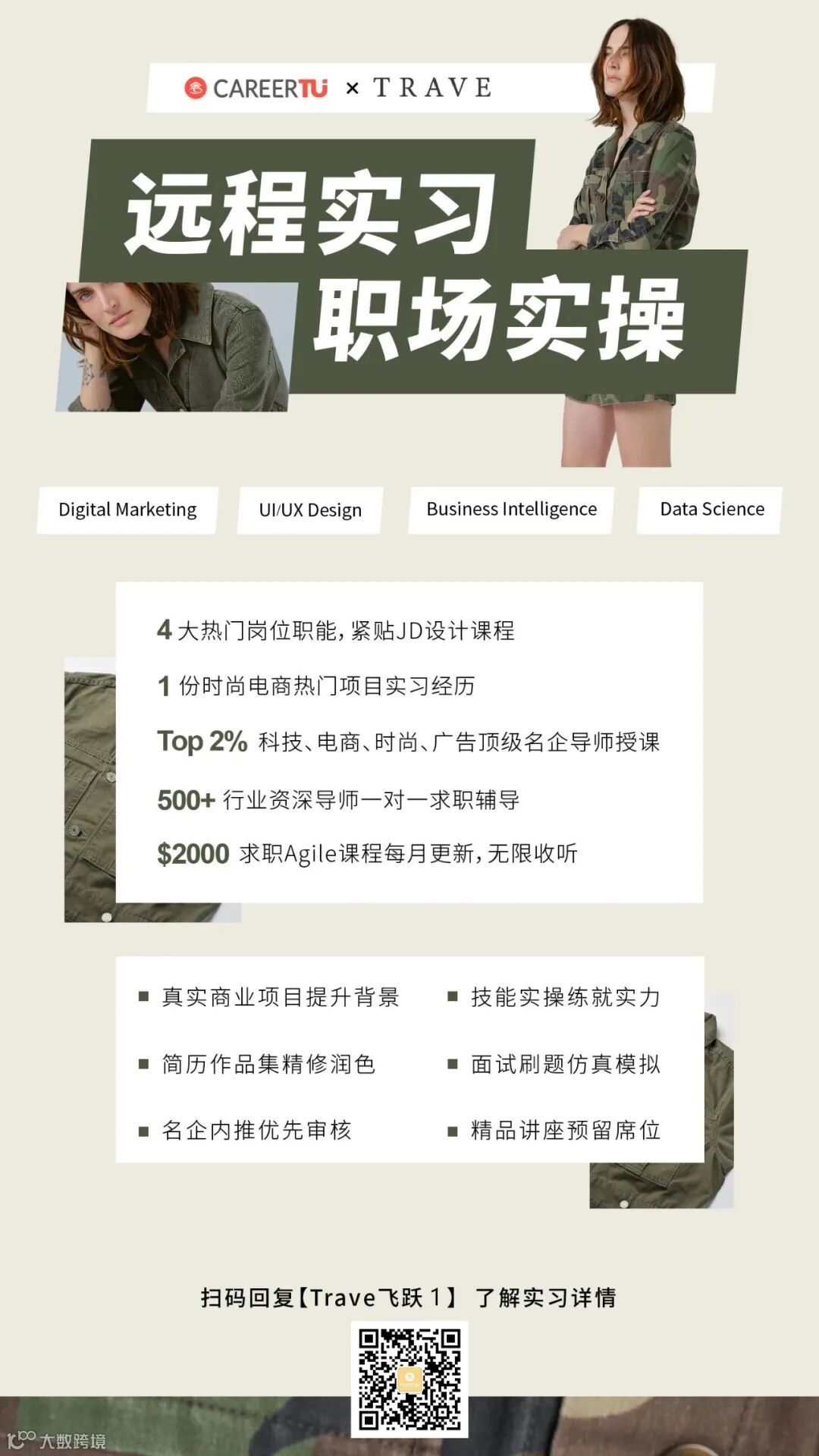 职图将与加州设计师品牌Trave合作推出飞跃计划专项,在全球范围内招收Digital Marketing, Business Intelligence, Data Science以及UI/UX Design四大方向的同学共同参与到联名款牛仔裤项目中,帮助同学们获得实际项目推广、落地、优化的全过程实操经验。
