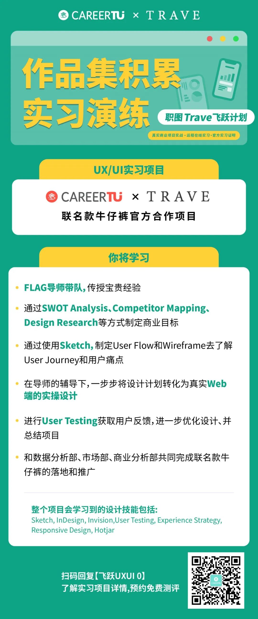 参加计划的学员在6个月的时间内,通过参与真实的商业项目,相互合作共同完成职图×Trave联名款牛仔裤网页搭建、营销推广和投放、商业智能分析及数据分析、优化的全过程。