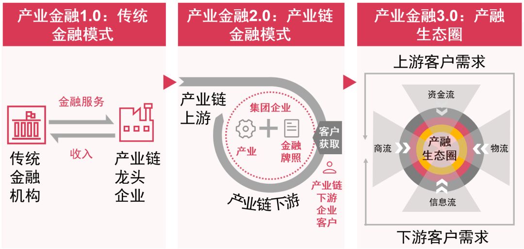 3.0 产融生态圈:以产业为核心,以平台为拓展方式的产融生态圈模式。以支持产业、服务产业的方式,开展金融撮合乃至金融业务,通过平台化方式集合商流、物流、资金流、信息流,并通过科技手段实现线上化发展。