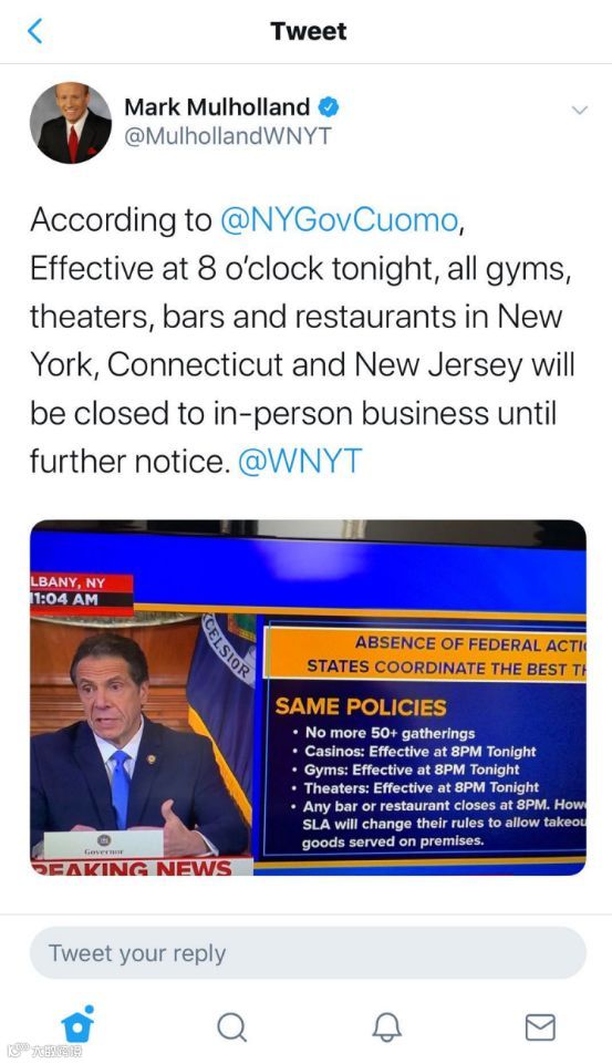 另外,纽约政府还明文规定,自3月17日起,纽约市的酒吧、夜店、电影院、小剧场将全部关闭。另外,周一早间,新泽西州州州长Gov. Phil Murphy宣布,从本周一开始,全州范围内实施“宵禁”,居民将在晚上8点-次日凌晨5点不得外出。赌场、酒吧、电影院、健身房等场所必须在8点前关门,餐厅营业时间内,不得堂食,仅限外带和外卖。
