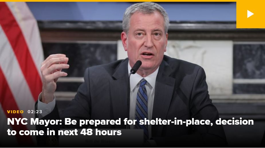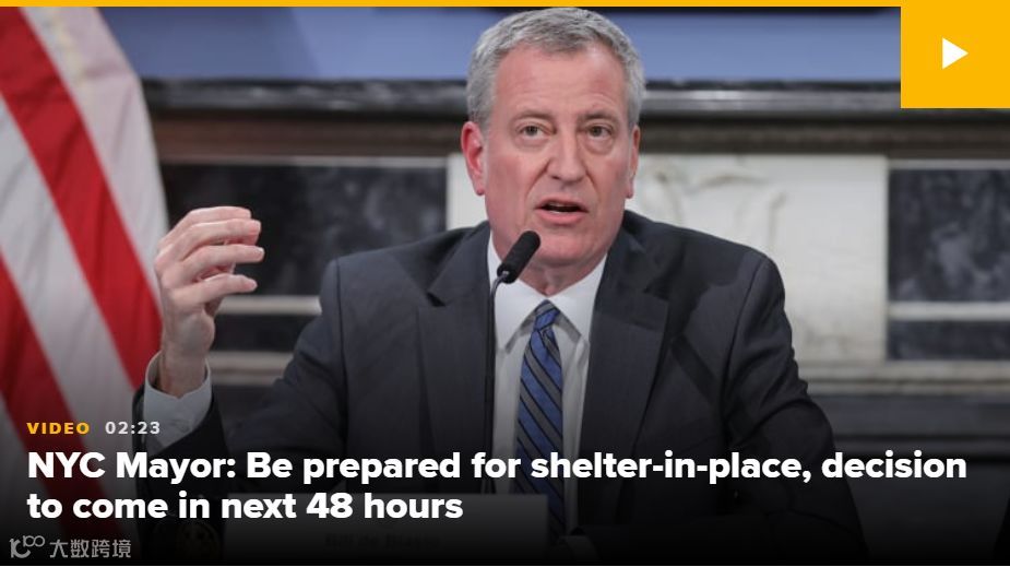 3月17日美东时间下午,纽约市市长Bill de Blasio表示,为抑制新冠病毒的快速传播,纽约市民应在未来几天为“居家防疫”行政令做好准备,目前纽约市或纽约州尚未做出决定,但可能会在接下来的48小时内做出决定并宣布。