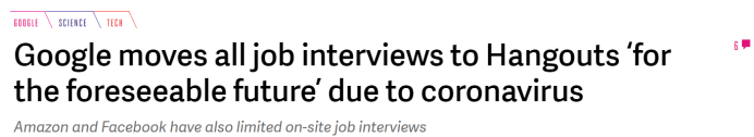鉴于目前正在爆发的冠状病毒疫情,谷歌并不是第一个取消现场采访的科技巨头。就在上周一,Facebook表示将取消大部分现场面试,Amaozn上周也无限期推迟了On-site面试。