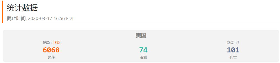 截至2020-3-17 16:56 EDT, 美国COVID-19实时数据如下: