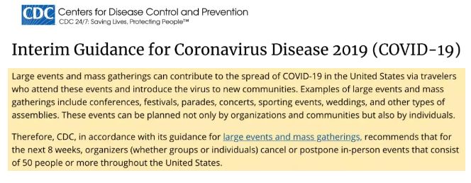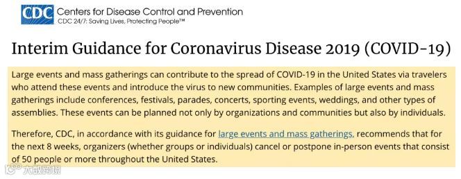 同时,美国疾控中心在周日宣布:建议美国各州各城的官员禁止50人以上的大型聚会(例如婚礼、运动会、庆典、音乐会等)至少8个星期,以阻止病毒的传播,学校、高校和必须维持日常运作的企业除外。