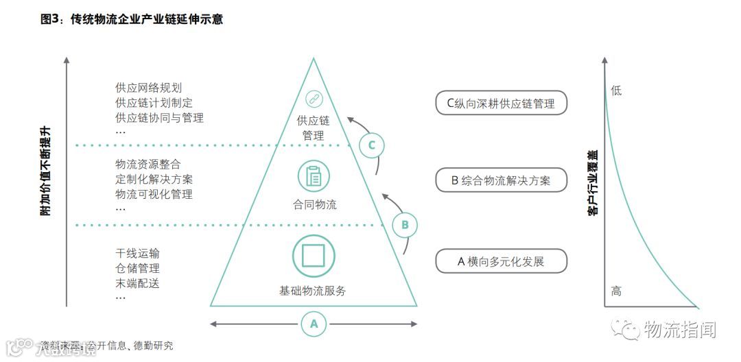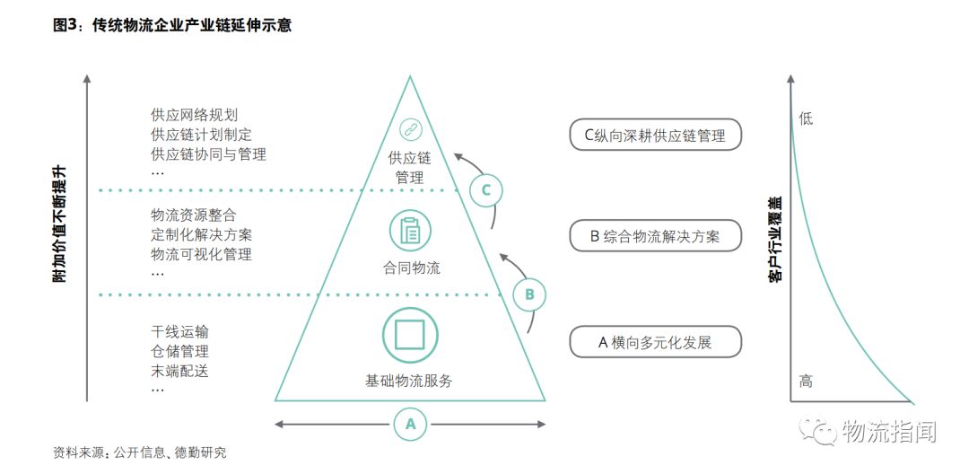 传统物流企业积极寻求产业链协同发展传统物流企业积极沿产业链延伸,不断提高价值创造能力,以转型升级应对物流“新常态”。处于不同发展阶段和服务水平层次的传统物流企业,都在基于核心能力探索多种商业模式的可能性,主要包括横向多元化发展,纵向供应链物流深耕,以及综合物流解决方案。