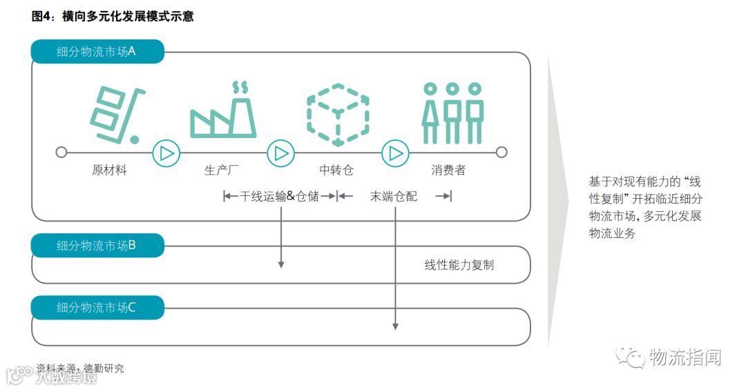 总而言之,对于基础物流服务商,横向扩张势必是当前发展和转型的优先选择之一。经过多年业务开展,它们累积了丰富的物流资源,如网点、线路等要素,以及品牌等无形资产。依托上述资源,这些企业得以将服务能力向临近细分市场“线性复制”,甚至实现业务的扩张。