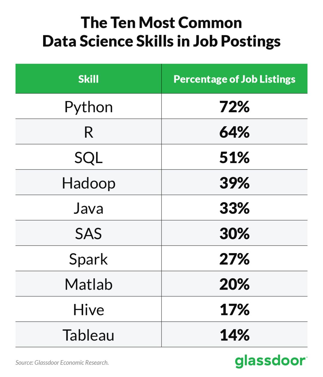 Python是最常见的技能,在72%的Job Description中都提到了Python,紧随其后的是R(64%)和SQL(51%)。不出所料,在Glassdoor这项研究的样本中,每10个招聘职位中就有9个要求至少具备其中一项技能。
