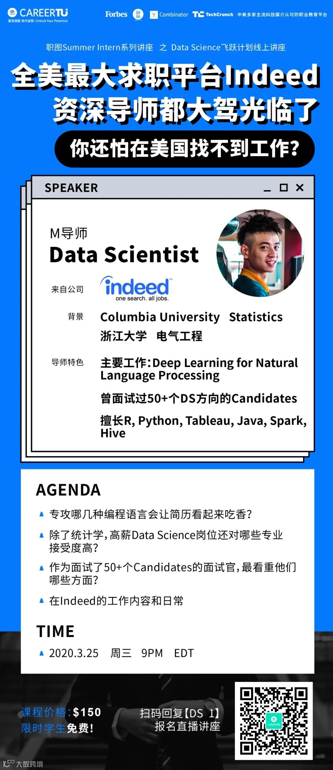 我们邀请了毕业于浙大、哥大,就职于全美最大求职平台Indeed的资深导师,分享数据分析方向的面试经验和求职经验。