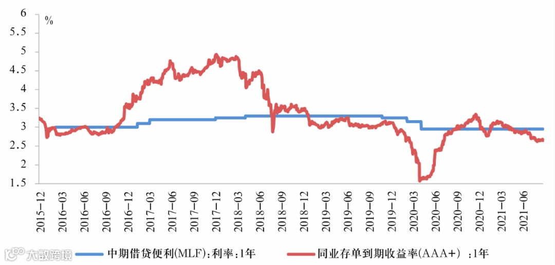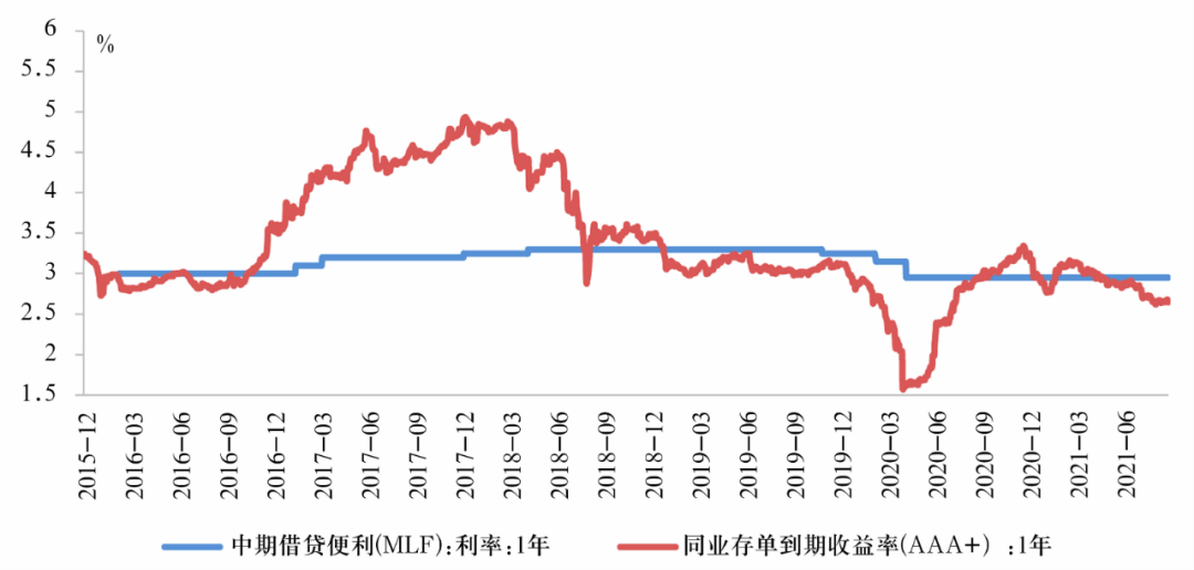 (二)中期借贷便利(MLF)利率。MLF利率是央行中期政策利率,与公开市场操作7天期逆回购利率共同构成了央行政策利率体系。目前1年期MLF利率为2.95%,代表了银行体系从中央银行获取中期基础货币的边际资金成本。2019年以来,人民银行逐步建立MLF常态化操作机制,每月月中开展一次MLF操作,通过以相对固定的时间和频率开展操作,提高操作的透明度、规则性和可预期性,向市场连续释放中期政策利率信号,引导中期市场利率。以一年期同业存单(AAA+)到期收益率为例,近两年除2020年一季度受新冠肺炎疫情冲击影响,与MLF利率出现临时性偏离以外,其他时间基本围绕MLF利率为中枢波动。