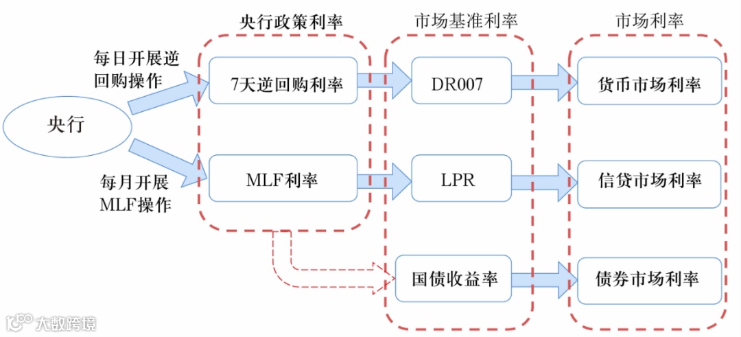 经过近30年来持续推进利率市场化改革,目前我国已基本形成了市场化的利率形成和传导机制,以及较为完整的市场化利率体系,主要通过货币政策工具调节银行体系流动性,释放政策利率调控信号,在利率走廊的辅助下,引导市场基准利率以政策利率为中枢运行,并通过银行体系传导至贷款利率,形成市场化的利率形成和传导机制,调节资金供求和资源配置,实现货币政策目标。
