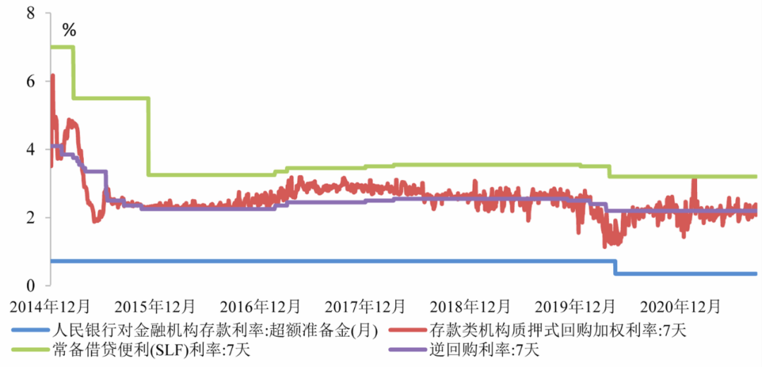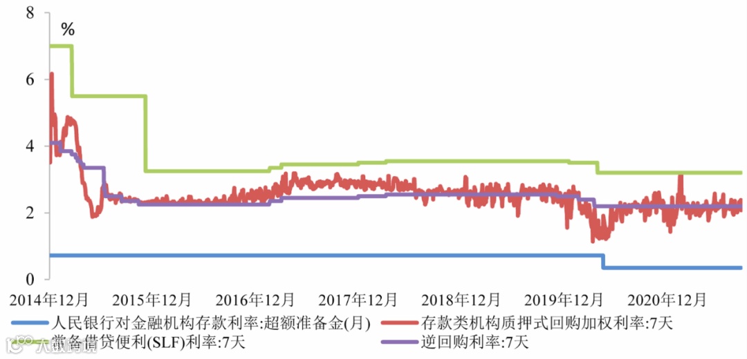 (一)公开市场操作(OMO)利率与利率走廊。公开市场操作7天期逆回购利率是央行短期政策利率,目前利率水平为2.2%。央行通过每日开展公开市场操作,保持银行体系流动性合理充裕,持续释放短期政策利率信号,使存款类金融机构质押式回购利率(DR)等短期市场利率围绕政策利率为中枢波动,并向其他市场利率传导。同时,通过以常备借贷便利(SLF)利率为上限、超额准备金利率为下限的利率走廊的辅助,将短期利率的波动限制在合理范围。其中,SLF是央行按需向金融机构提供短期资金的工具,由于金融机构可按SLF利率从央行获得资金,就不必以高于SLF利率的价格从市场融入资金,因此SLF利率可视为利率走廊的上限。目前7天期SLF利率为3.2%,也就是7天期公开市场逆回购利率加100个基点。近期,人民银行推动SLF电子化操作方式改革,有序实现全流程电子化,有利于提高操作效率,稳定市场预期,增强银行体系流动性的稳定性,维护货币市场利率平稳运行,有效防范流动性风险。超额准备金利率是央行对金融机构存放在央行的超额准备金付息的利率,由于金融机构总是可以将剩余资金放入超额准备金账户,并获得超额准备金利率,就不会有机构愿意以低于超额准备金利率的价格向市场融出资金,因此超额准备金利率可视为利率走廊的下限。目前超额准备金利率为0.35%。