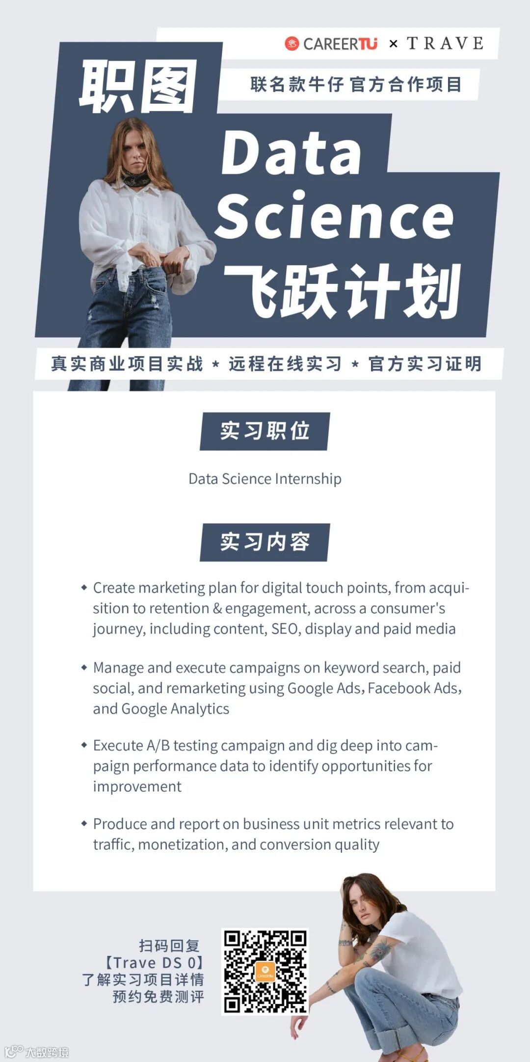 职图今年推出的飞跃计划,面向Digital Marketing、UIUX Design和Business Intelligence,Data Science四个求职方向的同学招生!参加计划的学员在6个月的时间内,通过参与真实的商业项目,相互合作共同完成职图×Trave联名款牛仔裤网页搭建、营销推广和投放、商业智能分析及数据分析、优化的全过程。