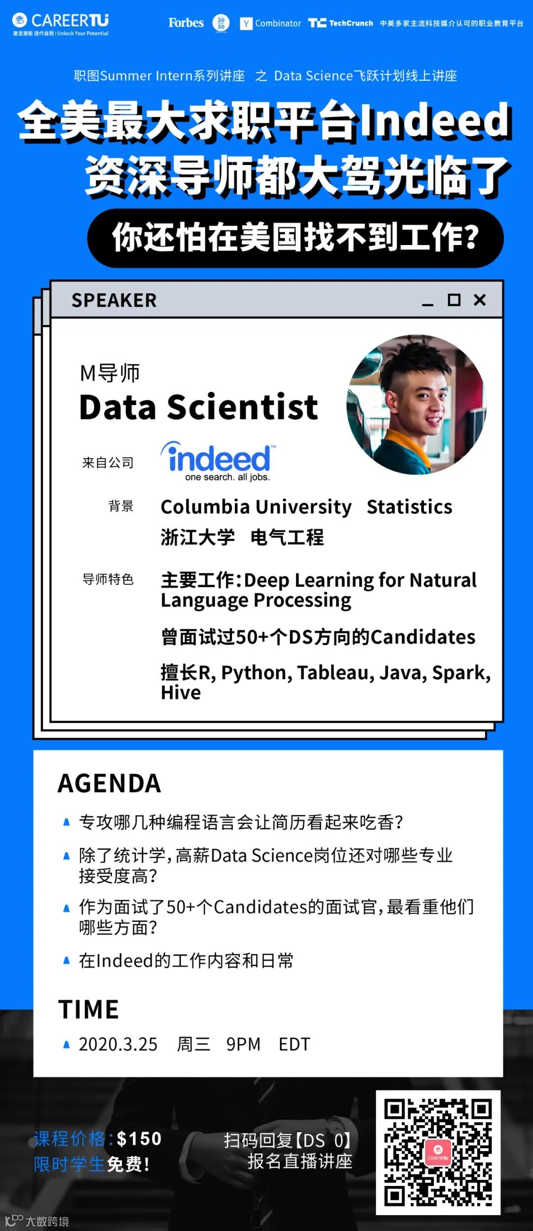 我们邀请了毕业于浙大、哥大,就职于全美最大求职平台Indeed的资深导师,分享数据分析方向的面试经验和求职经验。