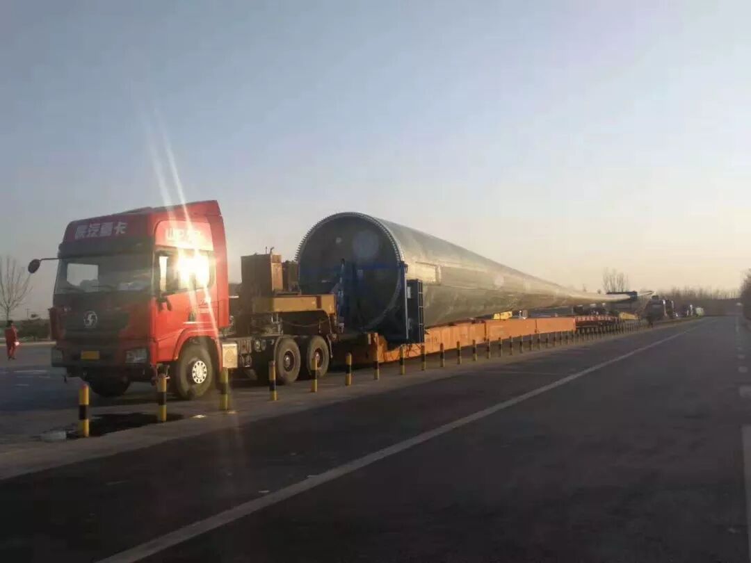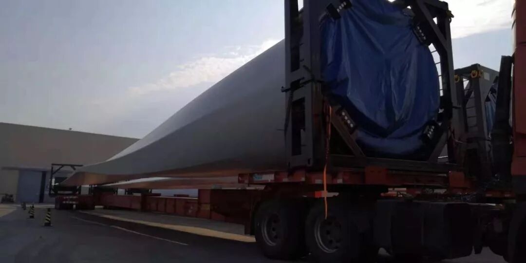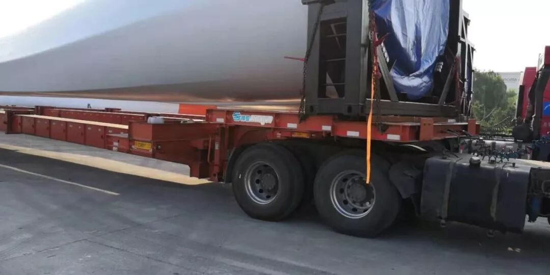 盐城大丰-上海的风电叶片运输,2018.10月,我司接到一批风电设备运输委托,箱单详情为6件85米长叶片+8件65米长叶片,要求从盐城大丰拉到上海准备海运出口,由于时间紧急,任务重,叶片需要再一个礼拜之内全部安全运到上海港,我司立马安排外勤考察线路,预估风险,联系相关道路运输部门,打通路上可能遇到的一切阻碍。安排调度车辆,保证了此次风电项目的顺利运输完成。