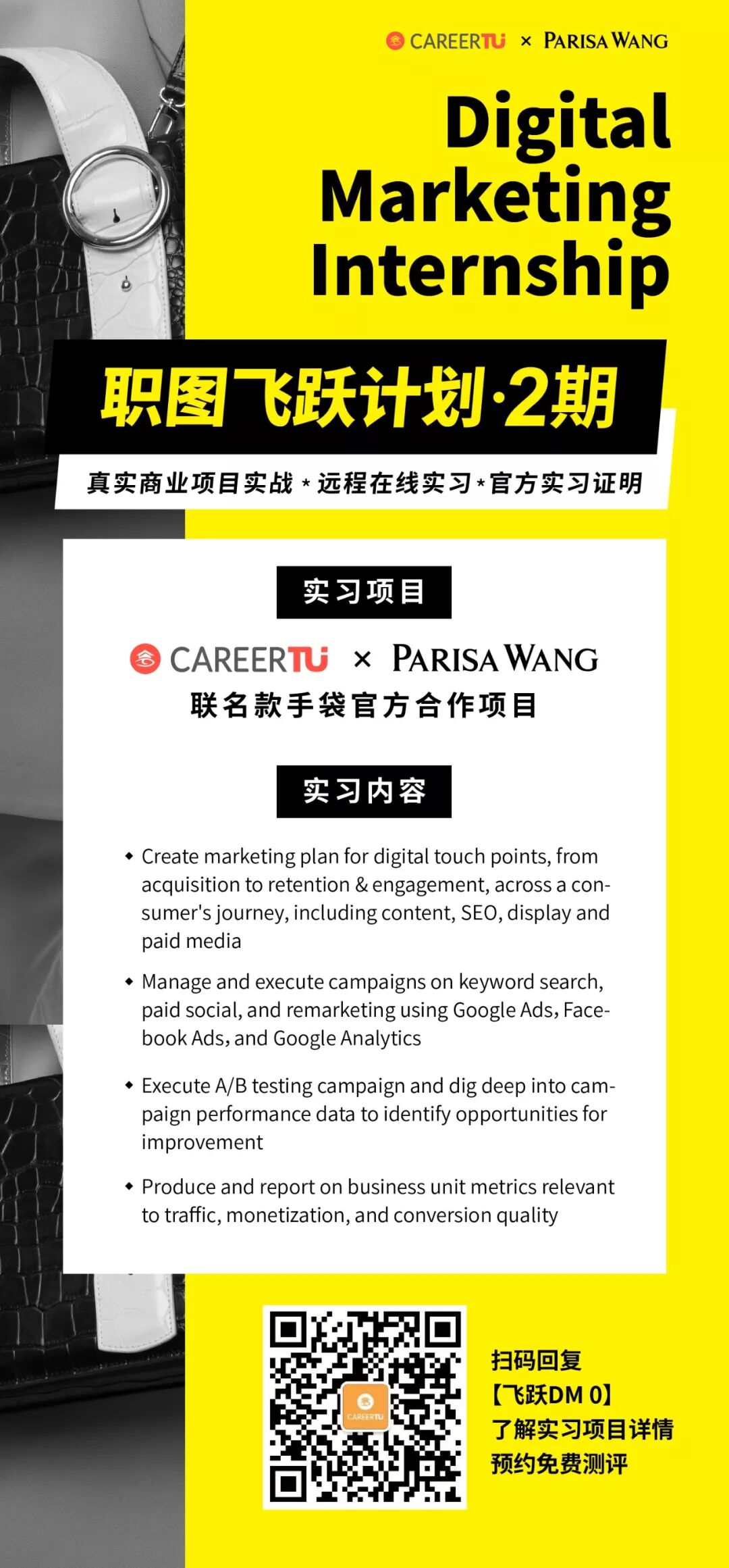 PW飞跃计划是职图与知名设计师电商品牌Parisa Wang合作,推出联名款合作包包,由职图资深导师带队飞跃计划学员一起通过参与真实的商业项目,相互合作共同完成产品网页搭建、营销推广和投放、商业智能分析及优化的全过程。