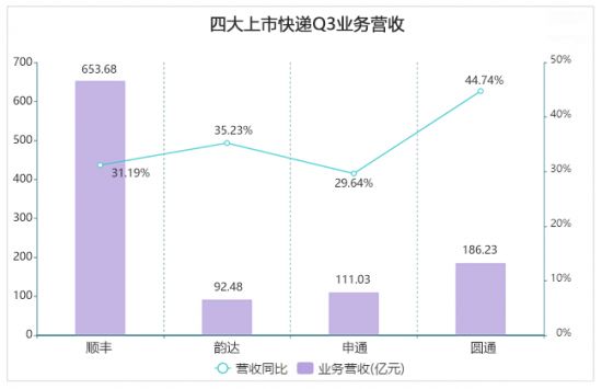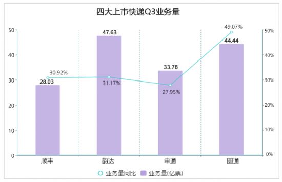 根据中国邮政局公布的《关于2018年前三季度邮政行业经济运行环境的传递》,2018年前三季度,全国快递营业量完成347.4亿件,同比增加26.8%;快递营业收入实现4246.3亿元,同比增加24%。顺丰、韵达、圆通、申通四大快递股前三季度合计实现营业量153.88亿件,占全国总营业量的44.3%。