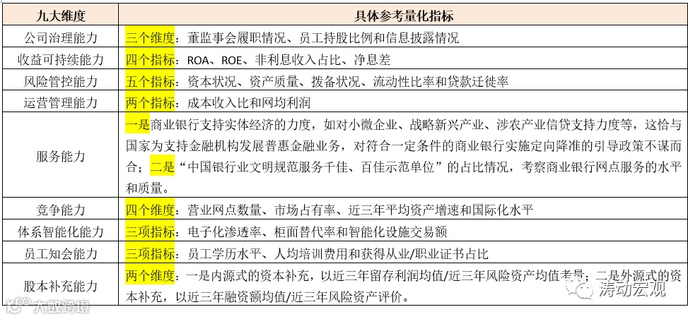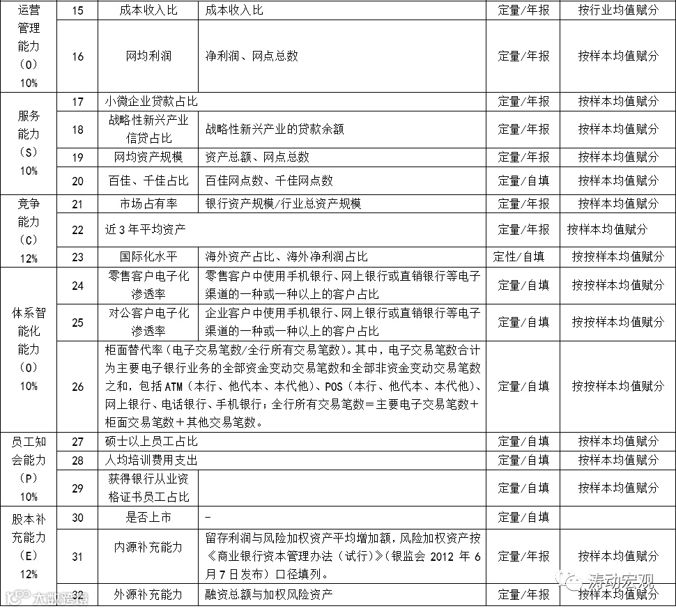 监管评级之外,始于2015年的陀螺评价体系这里也略微提及一下。2013年中国银行业协会成立课题组进行研究,并于2015年正式推出“陀螺”(GYROSCOPE)评价体系,从公司治理能力(Governance)、收益可持续能力(Yield sustainability)、风险管控能力(Risk control)、运营管理能力(Operational management)、服务能力(Service quality)、竞争能力(Competitiveness)、体系智能化能力(Organizational intellectualization)、员工知会能力(Personnel competence)、股本补充能力(Equity funding)等九个维度32项指标入手,对全国性银行与地方性银行进行综合评价。不过这几年,陀螺评价体系的影响力和受到的关注度有下降的趋势。